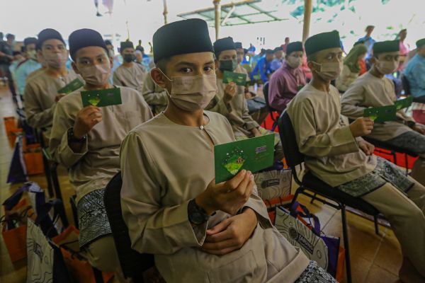 Sebahagian anak yatim menunjukkan sumbangan Aidilfitri Yayasan Islam Darul Ehsan (Yide) yang disampaikan Duli Yang Teramat Mulia (DYTM) Raja Muda Selangor Tengku Amir Shah di Rumah Anak Yatim Hidayah Al Hijrah, Hulu Langat pada 1 April 2023. Foto HAFIZ OTHMAN/SELANGORKINI