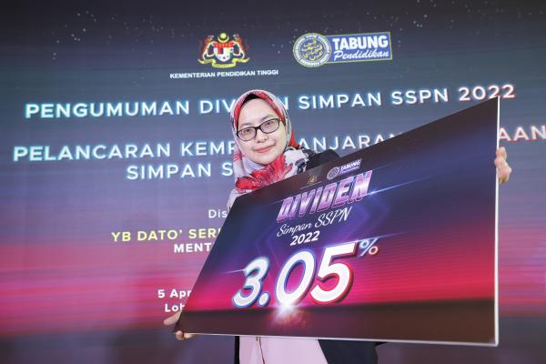 PUTRAJAYA, 5 APRIL: Perbadanan Tabung Pendidikan Tinggi Nasional (PTPTN) hari ini mengumumkan dividen Skim Simpanan Pendidikan Nasional (Simpan SSPN) bagi 2022 sebanyak 3.05 peratus.