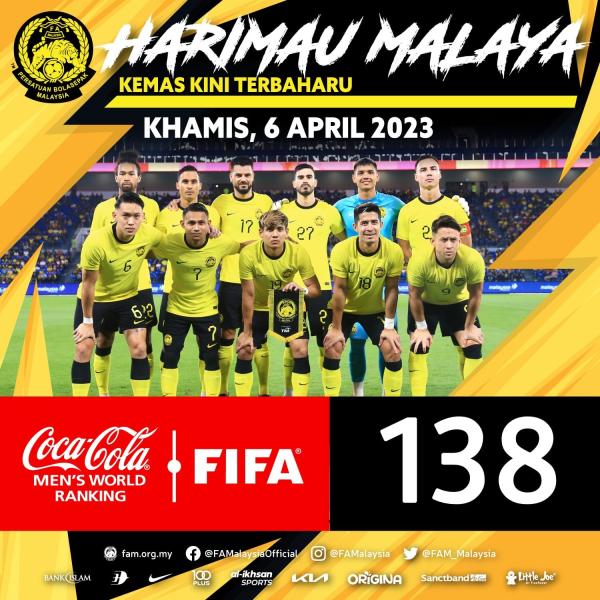 Kenaikan ranking dipengaruhi oleh dua kemenangan yang dilakar skuad negara ke atas Turkmenistan serta Hong Kong pada aksi persahabatan antarabangsa Tier 1 di Stadium Sultan Ibrahim, Johor pada Mac lepas.
