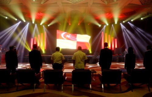Bendera negeri Selangor berkibar megah ketika lagu negeri Selangor dimainkan dengan dihiasi cahaya lampu merah kuning sempena majlis pecah tanah NCT Smart Industrial Park di Movenpick Convention Centre, Sepang pada 7 April 2023. Foto MOHD YUSN ARIFFIN/SELANGORKINI