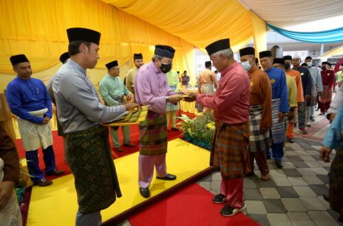 Duli Yang Maha Mulia (DYMM) Sultan Selangor Sultan Sharafuddin Idris Shah Alhaj berkenan menyampaikan sumbangan kepada golongan asnaf pada majlis perasmian Masjid Taman Alam Jaya sempena program berbuka puasa bersama rakyat di Puncak Alam, Kuala Selangor pada 8 April 2023. Foto AHMAD ZAKKI JILAN/SELANGORKINI