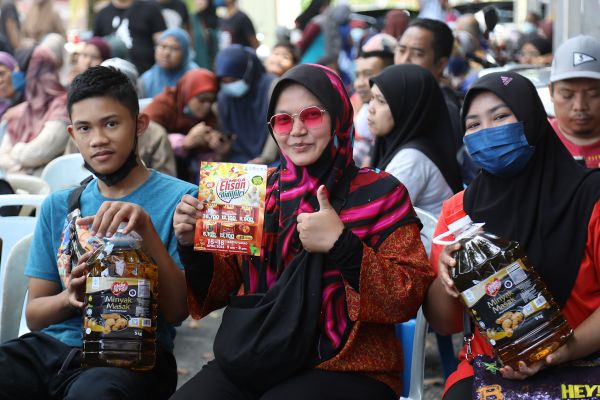 Liyana Ahmad (tengah) menunjukkan tanda bagus selepas mendapatkan barangan keperluan sempena pelancaran Jualan Mega Ehsan Aidilfitri di Jalan PJS 2C/5, Flat PKNS, Petaling Jaya pada 9 April 2023. Foto REMY ARIFIN/SELANGORKINI