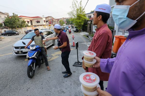 Ahli Jawatankuasa surau mengagihkan bubur lambuk kepada penduduk secara pandu lalu ketika majlis doa selamat dan berbuka puasa di Surau Al-Karimiah, Gombak pada 12 April 2023. Foto FIKRI YUSOF/SELANGORKINI