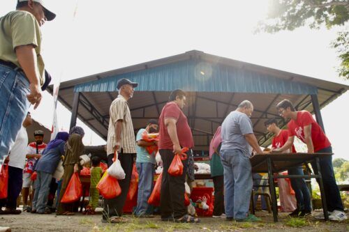 Orang ramai beratur untuk membuat bayaran setelah membeli barangan keperluan asas menerusi Program Jualan Mega Ehsan Aidilfitri di perkarangan PPR Seksyen 24, Shah Alam pada 15 April 2023. Foto NUR ADIBAH AHMAD IZAM/SELANGORKINI
