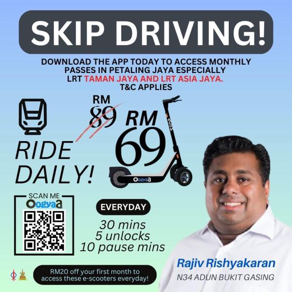 Rajiv berkata orang ramai boleh memuat turun aplikasi Oogya untuk menggunakan pas bulanan perkhidmatan e-skuter itu di Petaling Jaya khususnya di stesen LRT Taman Jaya dan Asia Jaya.