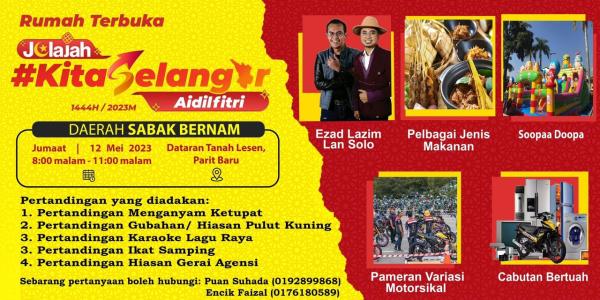 SHAH ALAM, 5 MEI: Penyanyi Ezad Lazim dan Lan Solo bakal memeriahkan sambutan rumah terbuka Jelajah Kita Selangor Aidilfitri (JKSA) daerah Sabak Bernam pada 12 Mei.