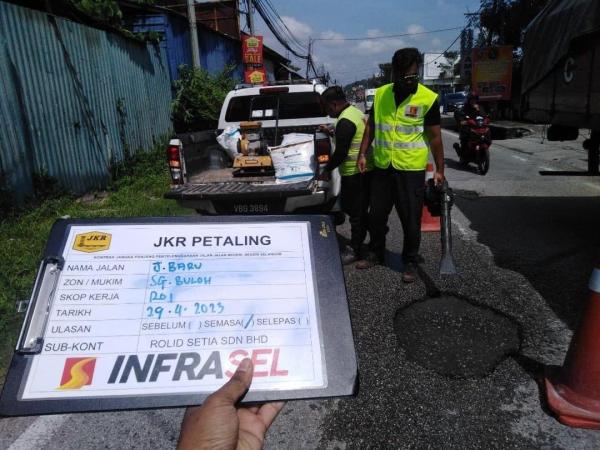 SHAH ALAM, 7 MEI: Infrasel Sdn Bhd (Infrasel) menjalankan kerja penurapan jalan rosak (R01) di Jalan Baru, Sungai Buloh di sini, pada 29 April lalu.