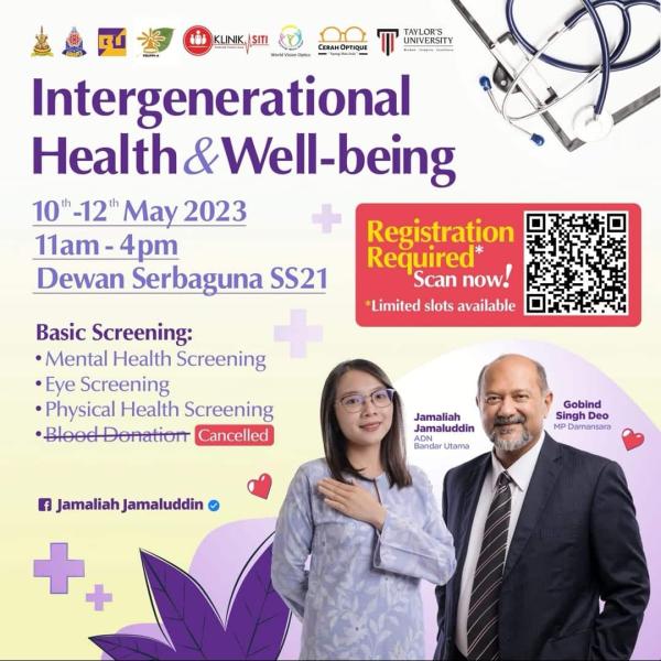 SHAH ALAM, 9 MEI: Warga Dewan Undangan Negeri (DUN) Bandar Utama mempelawa menyertai program Kesihatan dan Kesejahteraan Antara Generasi di Dewan Serbaguna SS21, Damansara Utama pada 10 hingga 12 Mei.