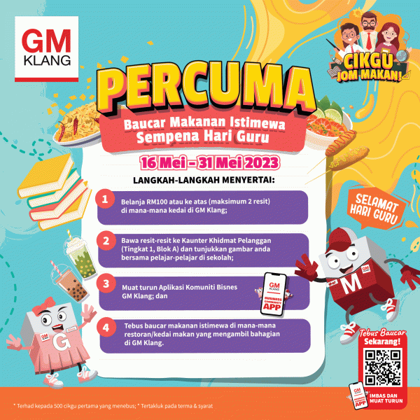 “Sebagai tanda penghargaan buat semua guru yang sudi berkunjung ke GM Klang, baucar makanan istimewa akan diagihkan secara percuma kepada 500 orang guru terawal yang membeli-belah sebanyak RM100 dan ke atas di mana-mana kedai di GM Klang dalam gabungan dua resit maksimum dan baucar ini boleh ditebus melalui Aplikasi Komuniti Bisnes GM Klang.
