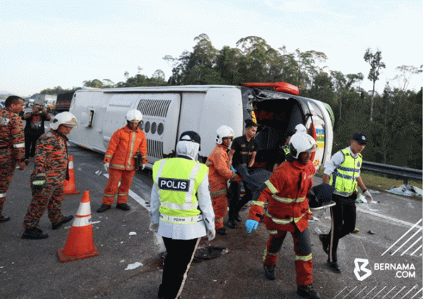 Bas yang membawa 30 penumpang itu dipercayai hilang kawalan sebelum terbabas ke lorong bertentangan.
