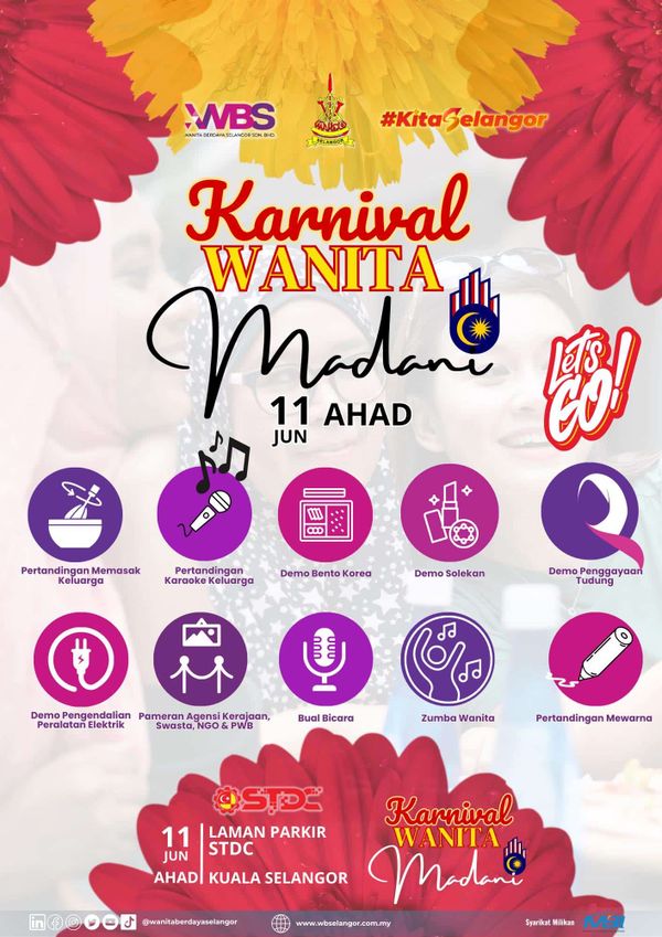 SHAH ALAM, 7 JUN: Orang ramai dijemput hadir ke Karnival Wanita Madani di laman tempat letak kereta Pusat Pembangunan Kemahiran Teknikal Negeri Selangor (STDC), Kuala Selangor, Ahad ini.