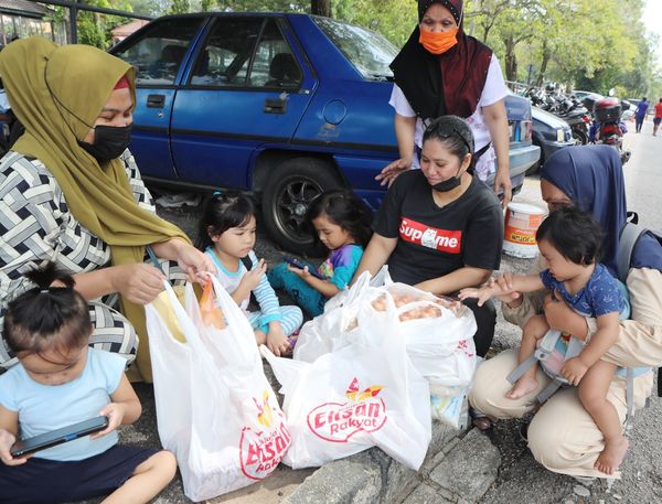 Tiga jiran tidak mahu melepaskan peluang membeli barangan keperluan asas yang dijual murah meskipun terpaksa membawa anak kecil mereka ke Program Jelajah Ehsan Rakyat DUN Subang Jaya di USJ 8, Subang Jaya pada 7 Jun 2023.Foto MOHD YUSNI ARIFFIN/SELANGORKINI