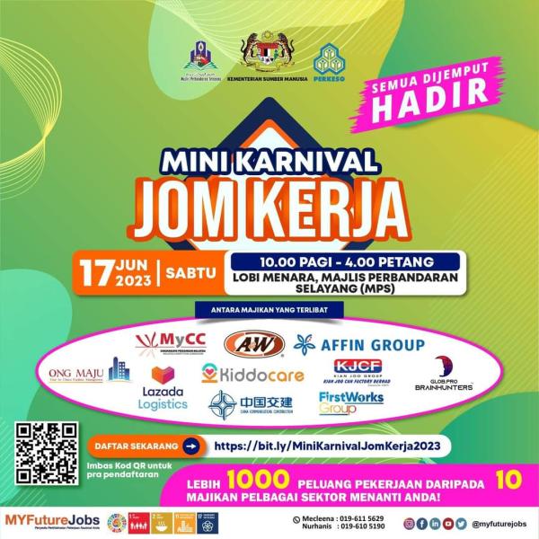 Orang ramai yang berminat boleh membuat pendaftaran di pautan bit.ly/MiniKarnivalJomKerja2023 atau sertai telegram untuk maklumat kerja kosong terkini di t.me/jawatankosonglembahklang