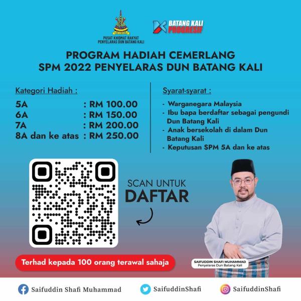 SHAH ALAM, 13 JUN: Pusat Khidmat Rakyat Penyelaras Dun Batang Kali menawarkan hadiah kepada 100 pelajar cemerlang Sijil Pelajaran Malaysia (SPM).