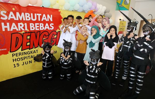 Pelajar Sekolah Kebangsaan Seksyen 7 yang melakonkan sketsa sambutan hari bebas denggi bergambar bersama sambil menunjukan tanda " pangkah bebas denggi " selepas pertunjukan pada Majlis Sambutan Hari Bebas Denggi peringkat Hospital Shah Alam di Hospital Shah Alam pada 15 Jun 2023. Foto MOHD YUSNI ARIFFIN/SELANGORKINI