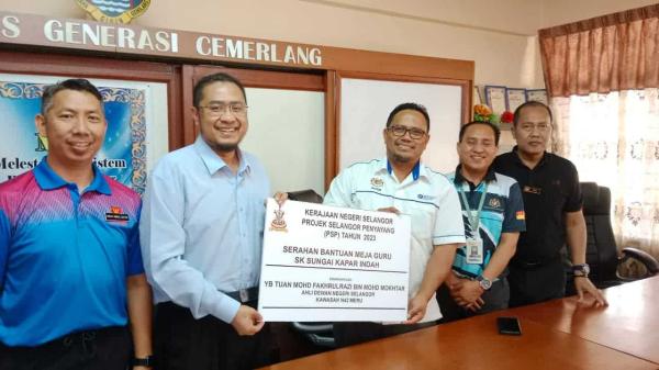 SHAH ALAM, 19 JUN : Dewan Undangan Negeri (DUN) Meru menghulur sumbangan RM50,000 bagi menggantikan meja dan perabot uzur bilik guru Sekolah Kebangsaan Sungai Kapar Indah, Klang hari ini.