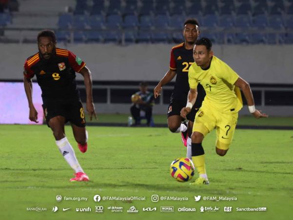 Aksi pemain Malaysia menentang Papua New Guinea pada perlawanan bola sepak persahabatan antarabangsa di Stadium Sultan Mizan Zainal Abidin pada 20 Jun 2023. Foto Facebook FAM[/caption]