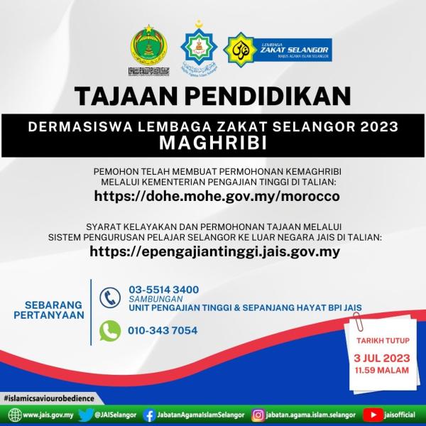 SHAH ALAM, 21 JUN: Pelajar lepasan Sijil Pelajaran Malaysia (SPM) 2022 negeri ini yang berhasrat melanjutkan pengajian ke institut pengajian tinggi di Maghribi dipelawa memohon dermasiswa Lembaga Zakat Selangor (LZS).
