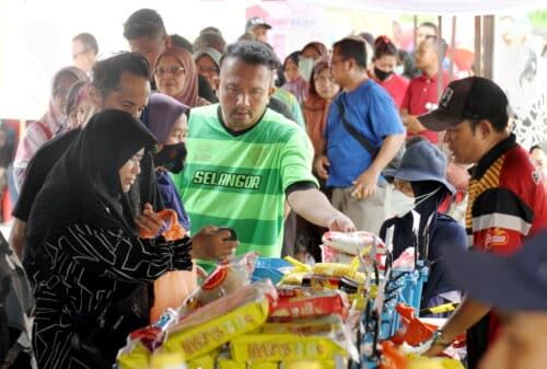 Orang ramai mendapatkan pelbagai jenis barangan asas dengan harga murah pada program Jualan Mega Ehsan Rahmah Aidiladha Parlimen Hulu Selangor di Dataran Niaga Serendah, Kuala Kubu Bharu pada 25 Jun 2023. Foto AFENDI MOHAMED/SELANGORKINI