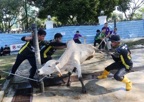 Sukarelawan bergotong royong menumbangkan lembu untuk dikorbankan selepas solat sunat Aidiladha di Masjid Sultan Salahuddin Abdul Aziz Shah, Shah Alam pada 29 Jun 2023. Foto AHMAD ZAKKI JILAN/SELANGORKINI