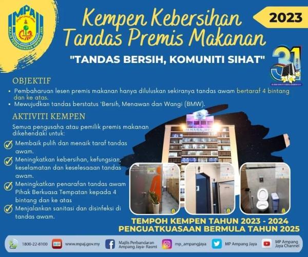 SHAH ALAM, 4 JULAI: Pengusaha dan pemilik kedai makanan sekitar Ampang Jaya digalakkan menyertai kempen kebersihan tandas anjuran Majlis Perbandaran Ampang Jaya (MPAJ).