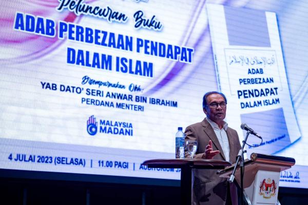 Perdana Menteri Datuk Seri Anwar Ibrahim menghadiri Majlis Perasmian Peluncuran Buku Adab Perbezaan Pendapat Dalam Islam di Auditorium JAKIM, Kompleks Islam Putrajaya, 4 Julai 2023. Foto Pejabat Perdana Menteri[/caption]
