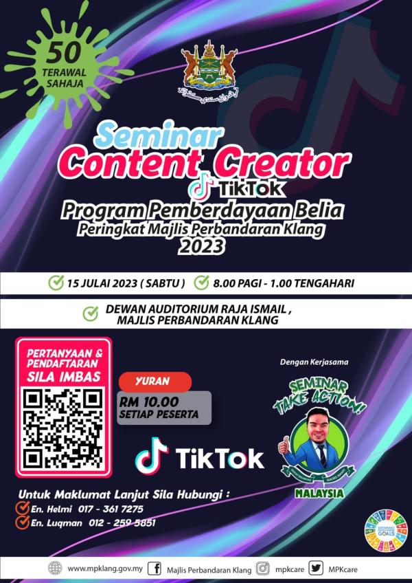 SHAH ALAM, 6 JULAI: Majlis Perbandaran Klang (MPK) mempelawa individu berumur 15 tahun ke atas menyertai seminar 'Content Creator' TikTok di Auditorium Raja Ismail pada Sabtu ini.