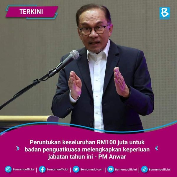 Anwar yang juga Menteri Kewangan telah meminta Ketua Setiausaha Perbendaharaan (KSP) Datuk Johan Mahmood Merican menyegerakan penyaluran peruntukan RM100 juta kepada agensi penguatkuasaan selewat-lewatnya akhir minggu depan.