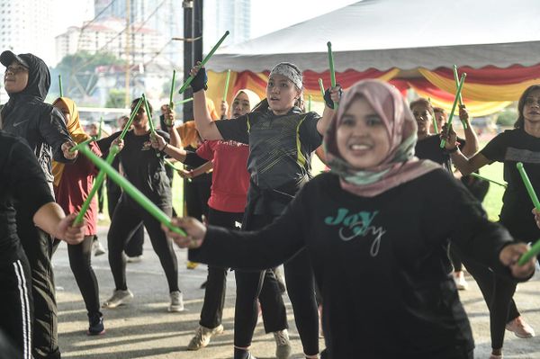 Peserta senaman aerobik Pound Fitness melakukan tarian sewaktu Program Sihat Wanita Pound Fitness di Padang Awam Batu Caves, Gombak pada 23 Julai 2023. Foto MOHD ARIF/SELANGORKINI