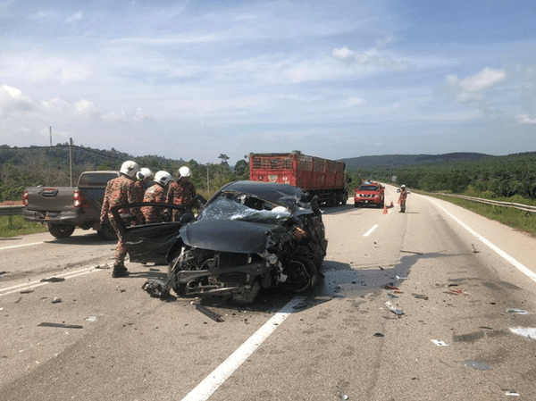 "Kemalangan berlaku apabila kereta Alza dari Segamat ke Kuantan disyaki hilang kawalan dan terbabas ke laluan bertentangan lalu bertembung dengan Myvi, yang turut dilanggar Vios dari arah Segamat ke Kuantan," katanya dalam kenyataan.