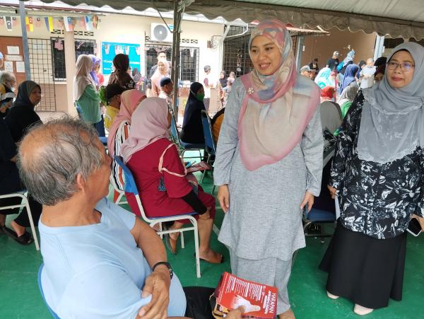 Calon Pakatan Harapan (HARAPAN) Dewan Undangan Negeri Hulu Kelang Juwairiya Zulkifli beramah mesra bersama penduduk pada program Jelajah Ehsan Rahmah Parlimen Gombak di Dewan JKKK, Kampung Kemensah, Gombak pada 27 Julai 2023. Foto SHAMZ JOHAN/SELANGORKINI.[/caption]