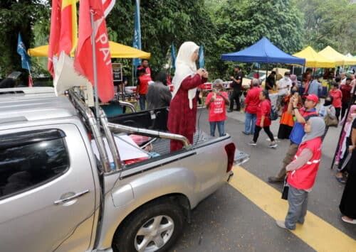Calon DUN Taman Templer, Anfaal Saari memperkenalkan diri sebagai calon kepada pengunjung dan peniaga pasar malam sempena program jelajah mesra (walkabout) di Pasar Malam Bukit Idaman Selayang pada 4 Ogos 2023. Foto MOHD YUSNI ARIFFIN/SELANGORKINI