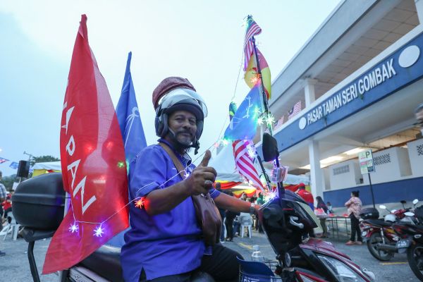 Mohd Yusoff Ismail, 65, bersama motosikalnya yang dihiasi dengan lampu serta bendera Pakatan Harapan dan Barisan Nasional ketika majlis Ramah Mesra Taman Sri Gombak di Pasar Taman Seri Gombak, Gombak pada 7 Ogos 2023. Foto FIKRI YUSOF/SELANGORKINI