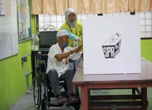 Petugas Suruhanya Pilihan Raya (SPR) membantu warga emas ketika membuang undi di Sekolah Kebangsaan Jalan Enam Bandar Baru Bangi, Kajang pada 12 Ogos 2023. SPR menetapkan hari ini sebagai hari mengundi enam negeri iaitu Selangor melibatkan 56 Dewan Undangan Negeri (DUN), Pulau Pinang (40, Negeri Sembilan (36), Kedah (36), Kelantan (45) dan Terengganu (32). Foto AHMAD ZAKKI JILAN/SELANGORKINI