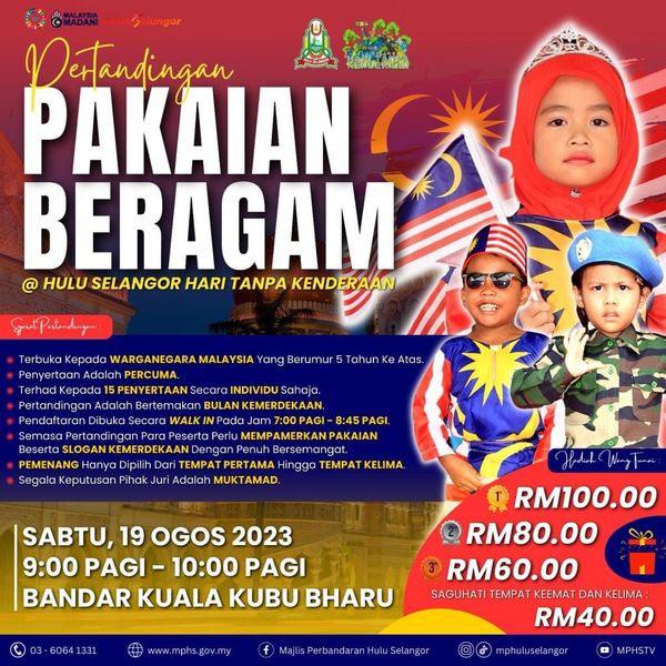 SHAH ALAM, 15 OGOS: Pertandingan nyanyian dan pakaian beragam patriotik kanak-kanak antara program menarik menanti orang ramai sempena Hari Tanpa Kenderaan anjuran Majlis Perbandaran Hulu Selangor (MPHS) Sabtu ini.