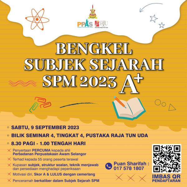 SHAH ALAM, 17 OGOS: Ahli Perbadanan Perpustakaan Awam Selangor (PPAS) yang akan menduduki Sijil Pelajaran Malaysia (SPM) tahun ini dipelawa menyertai bengkel subjek Sejarah SPM 2023 A+ pada 9 September.