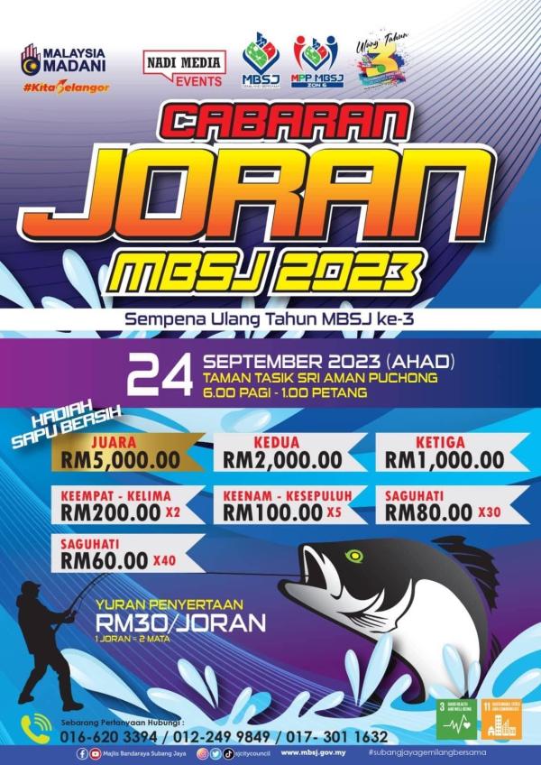 SHAH ALAM, 19 OGOS: Kaki pancing dijemput menyertai Cabaran Joran MBSJ 2023 yang menawarkan hadiah wang tunai keseluruhan RM13,700 di Taman Tasik Sri Aman Puchong pada 24 September ini.