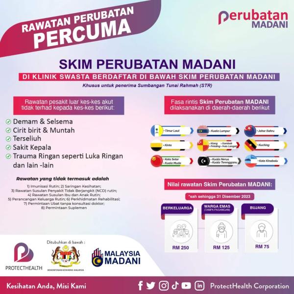 Maklumat lanjut mengenai Skim Perubatan Madani, termasuk semakan kelayakan dan senarai klinik panel boleh didapati di laman sesawang ProtectHealth.protecthealth.com.my/skimperubatanmadani atau hubungi 03-8687 2525.