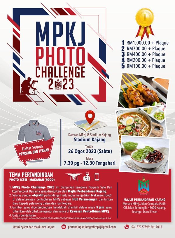 “Gambar yang dipertandingkan hendaklah diambil di kawasan pentadbiran MPKj serta dihantar terus kepada pihak urus setia sebelum jam 12.30 tengah hari di Booth MPKj Photo Challenge 2023 @ Karnival Sate dan Kopi Secocok Bersama.