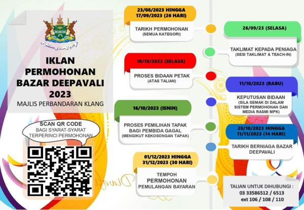 SHAH ALAM, 23 OGOS: Majlis Perbandaran Klang (MPK) mempelawa para peniaga untuk memohon tapak bazar Deepavali 2023 secara dalam talian bermula hari ini hingga 17 September.