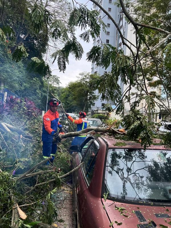 SHAH ALAM, 23 OGOS: Skuad Pantas Majlis Bandaraya Petaling Jaya (MBPJ) bertindak segera melakukan kerja pemotongan dan pengalihan dahan pokok yang menghempap sebuah kereta di Jalan 16/18, Seksyen 16, di sini semalam.