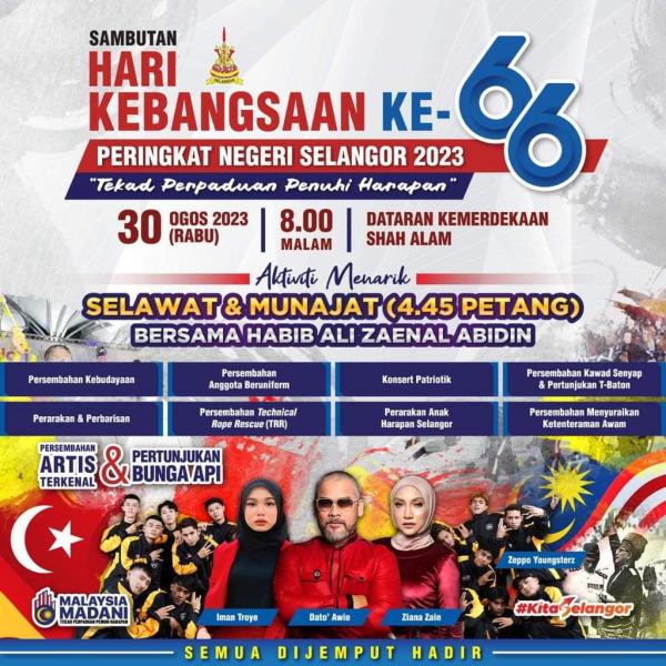 SHAH ALAM, 23 OGOS: Artis terkenal Awie, Ziana Zain dan Iman Troye antara yang akan membuat persembahan sempena sambutan Hari Kebangsaan Ke-66 peringkat negeri pada 30 Ogos ini.