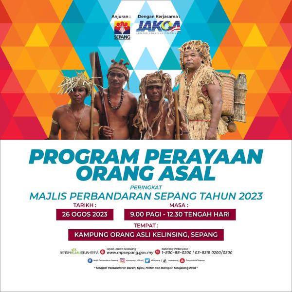 SHAH ALAM, 24 OGOS: Majlis Perbandaran Sepang (MPSepang) akan menganjurkan program Perayaan Orang Asal di Kampung Orang Asli Kelinsing, Sepang pada Sabtu ini, bermula jam 9 pagi hingga 12.30 tengah hari.