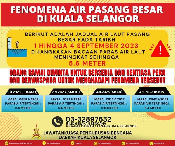 SHAH ALAM, 31 OGOS: Orang awam khususnya penduduk Kuala Selangor dinasihat sentiasa berwaspada dan peka susulan fenomena air pasang besar yang diramal bermula esok sehingga 4 September ini.