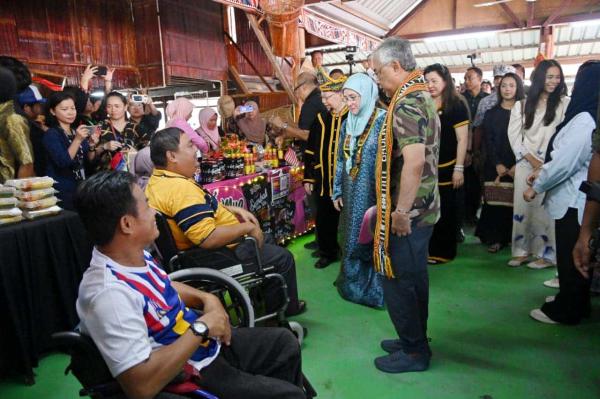 Al-Sultan Abdullah dan Tunku Azizah berkenan menyantuni dan bersalaman dengan Mat Jali sebelum melawat pameran mengenai kehidupan tradisi suku kaum rakyat Sabah di KDCA.
