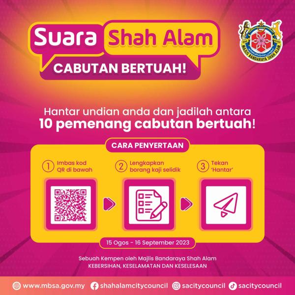 “Sertai kempen kaji selidik Suara Shah Alam dan undi restoran pilihan anda untuk peluang memenangi hadiah berupa wang tunai RM 100 bagi 10 pemenang bertuah.