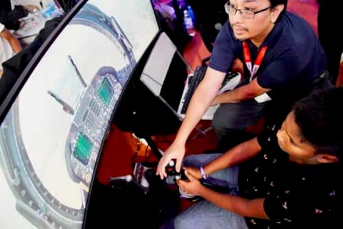 Ramveer Selvaganesan, 10, mencuba similator penerbangan ketika mengunjungi rerurai Emarque Technologies Sdn Bhd sempena Pameran Penerbangan Selangor 2023 di Pusat Penerbangan Wilayah Skypark, Shah Alam pada 8 September 2023. FOTO NUR ADIBAH AHMAD IZAM/SELANGORKINI