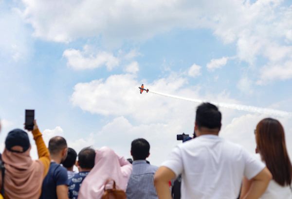 Orang ramai meyaksikan persembahan pesawat akrobatik daripada Juruterbang Akademi Penerbangan Layang - Layang Kapten John Scratchman ketika Pameran Penerbangan Selangor 2023 di Pusat Penerbangan Wilayah Skypark, Shah Alam pada 9 September 2023. Foto HAFIZ OTHMAN/SELANGORKINI