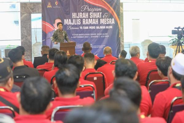 EXCO Keusahawanan Mohd Najwan Halimi berucap sempena program Temu Santai dan Hijrah Sihat bersama kakitangan agensi itu di foyer pusat pentadbiran rasmi Kerajaan Negeri, Shah Alam pada 14 September 2023. Foto REMY ARIFIN/SELANGORKINI[/caption]