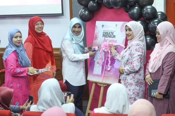 Isteri Dato' Menteri Besar Datin Seri Masdiana Muhamad (dua,kiri) melakukan gimik pelancaran program Keusahawanan Createpreneur 2023 di Akademi PKS dan Pembangunan Keusahawanan Malaysia (masmed), UiTM Shah Alam pada 14 September 2023. Foto REMY ARIFIN/SELANGORKINI